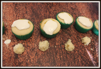Spoon approximately 2 teaspoons of lime curd per cupcake into the holes